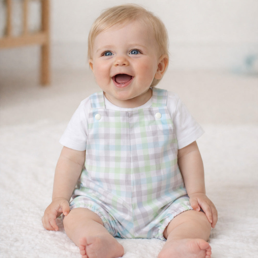 Ready for giggles and wriggles. A comfy romper with a little bit of stretch and cross-over straps that makes dressing easy. Size 0 to 6mths. Made in Bunbury, in WA's south west.