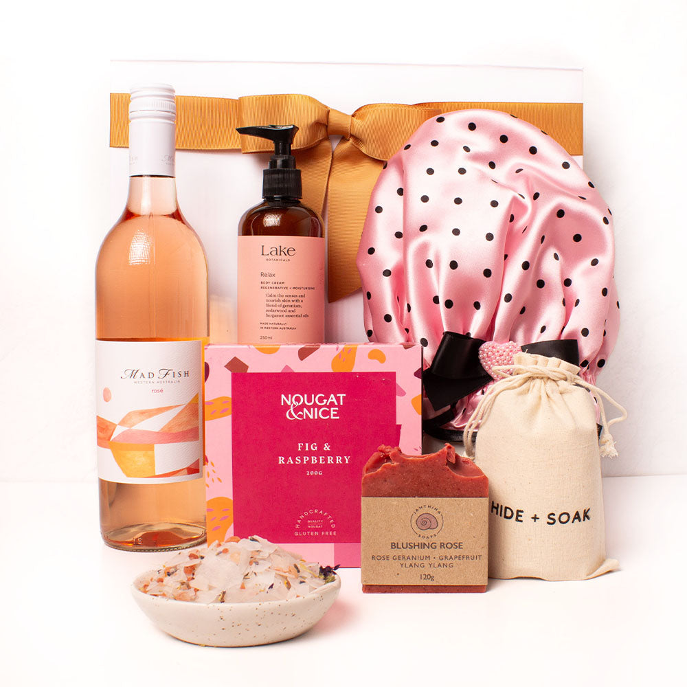 To complete the ritual, there’s a stunning handmade shower cap from So Pretty Shower Caps. The style included is Dottie, a pink cap with black trim, although you can choose from the others in our range to include one that suits her perfectly. These are glamorous shower caps handmade in the beautiful South West.