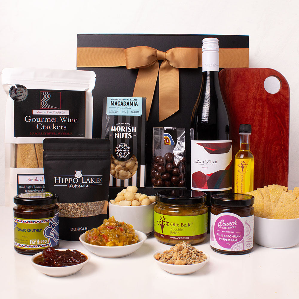 It begins with a beautifully handcrafted jarrah serving board by Paul from WA Wood Designs, rich wood tones and natural grain that brings the region’s character to the table and is a lovely reminder for them to keep. Alongside sits the 2024 Shiraz from MadFish, a wine that celebrates its heritage with juicy dark-berry fruit and subtle spice and is an elegant companion for the board and its snacks.