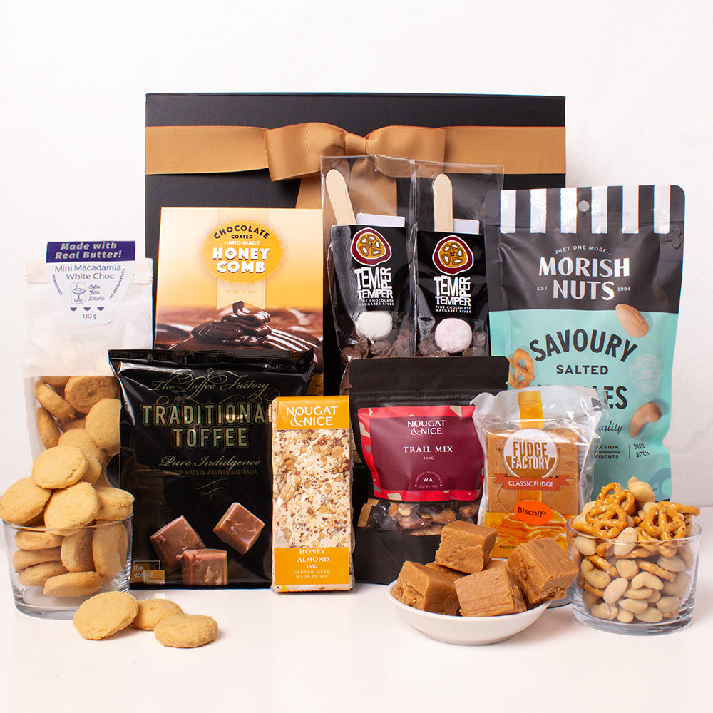 The lucky recipient can begin with handmade chocolate-coated honeycomb from Margaret River Fudge Factory, light and crisp with just the right touch of sweetness. Alongside it is the Traditional Toffee from The Toffee Factory in Denmark, a nostalgic, buttery treat just as you remember from your childhood.