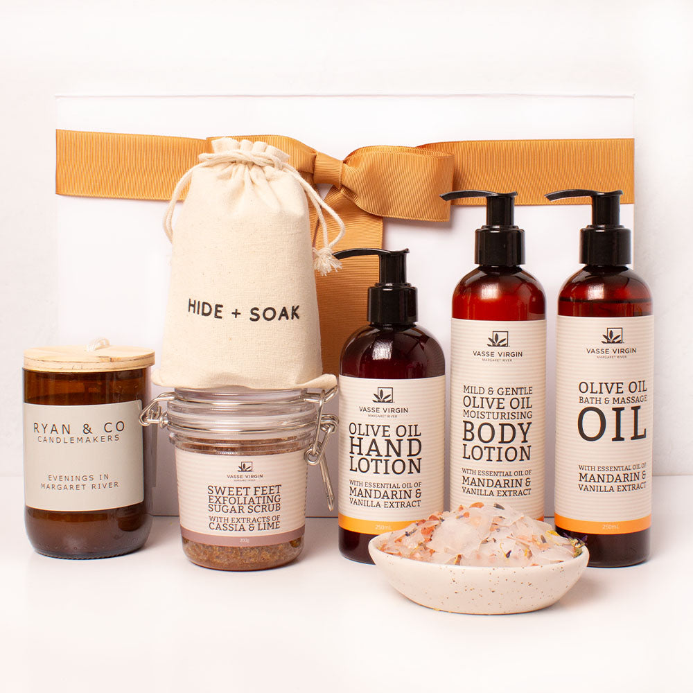 From Vasse Virgin, the Olive Oil Bath & Massage Oil, Body Lotion and Hand Lotion offer light hydration and a subtle, comforting fragrance that feels good on the skin without being heavy. The Sweet Feet Exfoliating Sugar Scrub adds a fresh, smoothing step, leaving the skin feeling clean and relaxed before a warm bath.